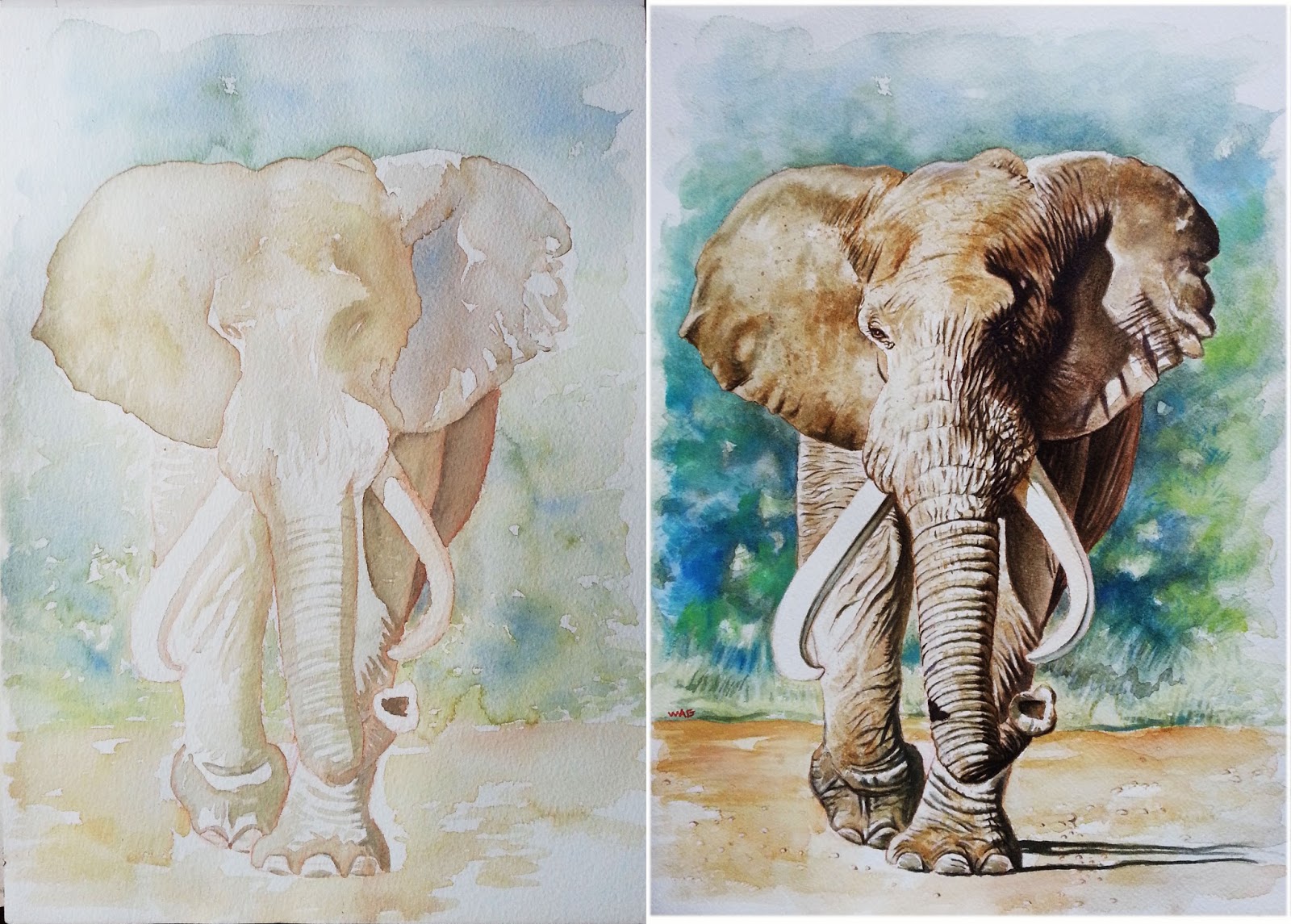 Éléphant 2 (aquarelle-sketch and final)